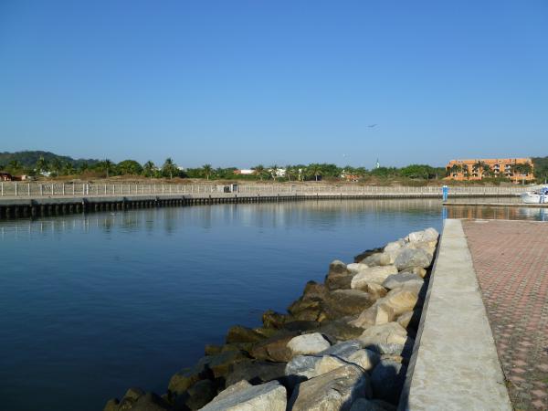 Just to add to the image. This photo shows our walk to the civilized section of the marina where there is power, water and wifi internet. That dirt is the fine powered kind that turns into muck in the rainy season and choking brown fog during the dry season. The rock piles come and go via dump truck and backhoe and you can imagine the clouds of dirt that engulf our boat. The small building in the background used to be the old marina office, but now it has become the computer room for the people who can't get wifi on the boat (the canal dwellers like us), but bring something to sit on. It is also the shower room (outdoor showers) and the public bathroom.