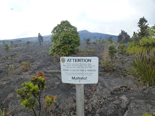 We took an amazing hike to Pu'u O'o Crater which is very active right now. While this trail is officially closed, we read the reports and tried it out. There was a 4 mile tropical rain forest hike, which took us up to edge of the lava flow. We were surprised to see that when we emerged from the forest the heat waves across the rocks were distorting everything. The lava has moved well past the boundary it reached during a large flow in '86 to '89. So far in fact it was in the process of burning all the vegetation around us. We could hear trees crackling and burning and there were areas of rock that would just suddenly start smoking! Good to know we could be airlifted out in an emergency...or was this just a cruel joke?
